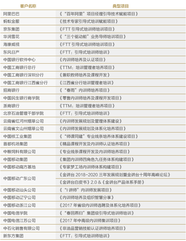 我們提供的不僅是內(nèi)訓(xùn)師管理制度設(shè)計(jì)原理,還包括流程分析與建設(shè)技術(shù)、內(nèi)訓(xùn)師管理工具模板、以及開展試點(diǎn)活動(dòng)等服務(wù)。方法體系來源于中國移動(dòng)、工商銀行、南方電網(wǎng)等標(biāo)桿企業(yè)實(shí)踐項(xiàng)目探索與積累。“實(shí)戰(zhàn)經(jīng)驗(yàn)+流程方法+工具模板+示范項(xiàng)目”保證體系導(dǎo)入的實(shí)用性。