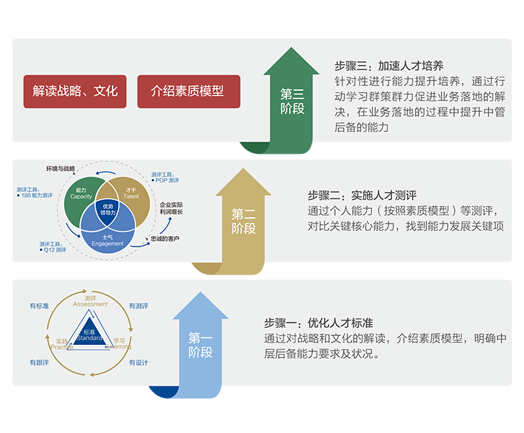 第三步:培養(yǎng)人,通過三個(gè)階段的培養(yǎng),在自我覺察、個(gè)體提升和團(tuán)隊(duì)引領(lǐng)、行動(dòng)學(xué)習(xí)業(yè)務(wù)落地等各個(gè)維度把中層后備培養(yǎng)成我們期望的目標(biāo)。