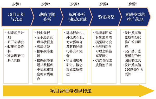 針對以上挑戰(zhàn),百年基業(yè)通過與公司高層的溝通,確定了首先根據(jù)企業(yè)的戰(zhàn)略建立素質(zhì)模型,確定干部培養(yǎng)選拔的標準,然后根據(jù)標準設(shè)計培養(yǎng)、選拔和測評體系的項目內(nèi)容,具體項目設(shè)計流程如下: