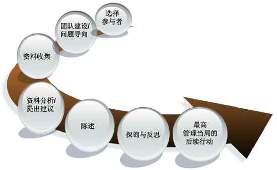整個項目過程分為五個階段,即:選擇問題參與者、團隊建設(shè)與問題導(dǎo)向(3-4 天)、資料收集(2-3 周)、資料分析與提出建議(1 周)、陳述(每小組90 分鐘)、探詢與反思(1天)、最高管理當(dāng)局的后續(xù)行動(陳述后的1-2 周)。