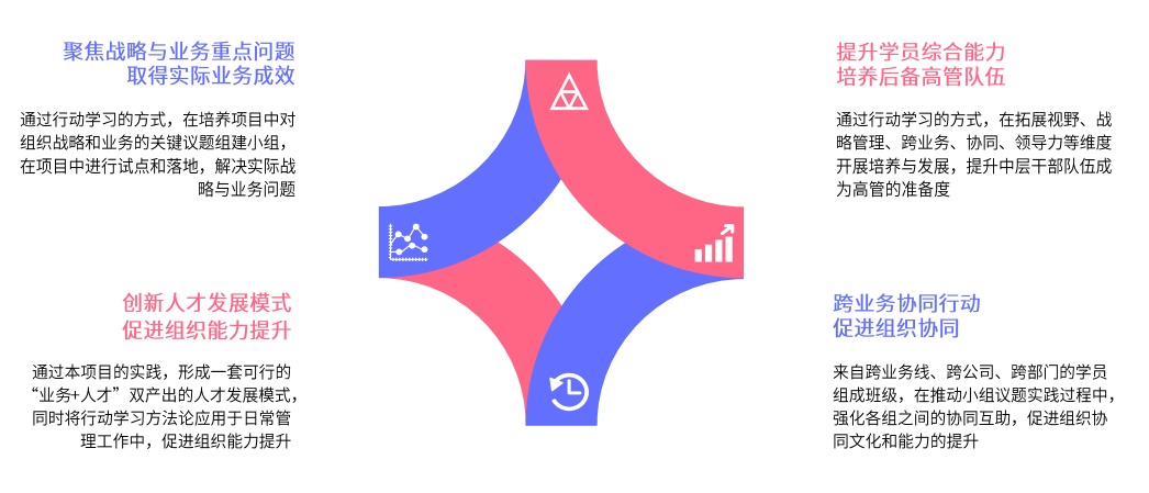 通過(guò)行動(dòng)學(xué)習(xí)的方式,在培養(yǎng)項(xiàng)目中對(duì)組織戰(zhàn)略和業(yè)務(wù)的關(guān)鍵議題組建小組,在項(xiàng)目中進(jìn)行試點(diǎn)和落地,解決實(shí)際戰(zhàn)略與業(yè)務(wù)問(wèn)題