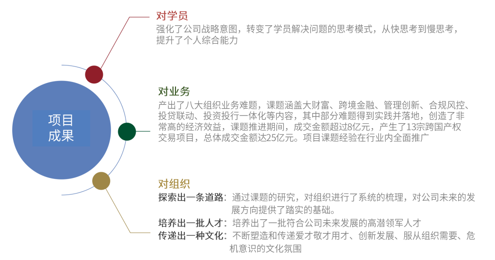 產(chǎn)出了八大組織業(yè)務(wù)難題,課題涵蓋大財(cái)富、跨境金融、管理創(chuàng)新、合規(guī)風(fēng)控、投貸聯(lián)動(dòng)、投資投行一體化等內(nèi)容,其中部分難題得到實(shí)踐并落地,創(chuàng)造了非常高的經(jīng)濟(jì)效益,課題推進(jìn)期間,成交金額超過(guò)8億元,產(chǎn)生了13宗跨國(guó)產(chǎn)權(quán)交易項(xiàng)目,總體成交金額達(dá)25億元。項(xiàng)目課題經(jīng)驗(yàn)在行業(yè)內(nèi)全面推廣
