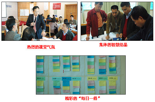 從本期的室內(nèi)課程來看,學(xué)員們的士氣還是非常高的!從互動(dòng)的知己知彼的溝通風(fēng)格到參與比較強(qiáng)的問題分析與解決,到高潮部分的授權(quán)、激勵(lì)與輔導(dǎo),團(tuán)隊(duì)中的每個(gè)人都非常主動(dòng)積極,每天課程結(jié)束后,大家都會(huì)填寫“每日一得”,在案例墻上粘貼自己對(duì)于課程的發(fā)現(xiàn),收獲與日后的行動(dòng)計(jì)劃!每日班委還會(huì)選出三位寫的最好的學(xué)習(xí)之星,并給予獎(jiǎng)勵(lì)!大家在團(tuán)結(jié),互助和競(jìng)爭(zhēng)的氣氛下,學(xué)習(xí)氛圍日益濃厚!
