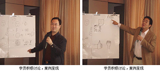 馬一鳴老師在課堂用如口頭贊賞、發(fā)撲克牌積分等方式調(diào)動(dòng)課堂氣氛,使四個(gè)小組形成競(jìng)爭(zhēng)格局,激勵(lì)學(xué)員參與互動(dòng)。32名學(xué)員被分成4個(gè)小組,每組有“小組長(zhǎng)”“書記員”“發(fā)言官”等角色職能。馬一鳴老師特別鼓勵(lì)學(xué)員提不同意見,對(duì)這樣的表現(xiàn),會(huì)有抽牌的機(jī)會(huì)。為了讓學(xué)員有活力,他還特地準(zhǔn)備與授課主題相關(guān)的書籍進(jìn)行適時(shí)的實(shí)物獎(jiǎng)勵(lì)。通過(guò)這樣調(diào)動(dòng)氣氛的設(shè)計(jì),整個(gè)2天課程,緊張而熱烈,條理而富激情,學(xué)員們?cè)谛β曋杏辛穗y忘的課堂體驗(yàn)。