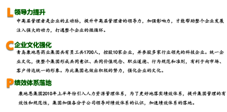 2011年4月6日,由康地恩藥業(yè)與北京百年基業(yè)管理顧問(wèn)公司合作的“康地恩藥業(yè)中高層領(lǐng)導(dǎo)力提升與發(fā)展”項(xiàng)目在山東青州如期盛大啟動(dòng)??档囟魉帢I(yè)是國(guó)內(nèi)領(lǐng)先的致力于動(dòng)物健康的集團(tuán)公司之一。歷經(jīng)十幾年發(fā)展,康地恩藥業(yè)集團(tuán)業(yè)務(wù)遍及全國(guó)各地和世界多個(gè)國(guó)家和地區(qū),隨著公司業(yè)務(wù)不斷增長(zhǎng)中高層管理者已經(jīng)成為了推動(dòng)企業(yè)發(fā)展的主動(dòng)脈,為了保證企業(yè)持續(xù)健康發(fā)展,公司加大了對(duì)中高層管理者領(lǐng)導(dǎo)力的培養(yǎng)和團(tuán)隊(duì)文化的建設(shè),根據(jù)和人力資源部的反復(fù)溝通,最終確定了三大提升點(diǎn):