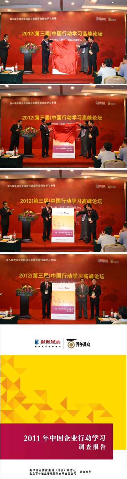《2010年中國企業(yè)行動(dòng)學(xué)習(xí)調(diào)查報(bào)告》自2010年發(fā)布以來,得到了國內(nèi)培訓(xùn)界、各大企事業(yè)單位以及各階媒體的聚焦關(guān)注。各方一致認(rèn)可的同時(shí)又對(duì)《2011年中國企業(yè)行動(dòng)學(xué)習(xí)調(diào)查報(bào)告》翹首企盼,故此2011年10月開始,新華報(bào)業(yè)傳媒集團(tuán)《培訓(xùn)》雜志社與百年基業(yè)再次聯(lián)手發(fā)起為期三個(gè)月的2011年度《行動(dòng)學(xué)習(xí)在中國企業(yè)的發(fā)展?fàn)顩r調(diào)查問卷》,以2010年調(diào)查問卷為基礎(chǔ),重新甄選選題,規(guī)整調(diào)查思路,在100多家企事業(yè)單位的通力配合下,終于完成了2011年度的調(diào)查報(bào)告。本次報(bào)告通過更加清晰的數(shù)據(jù),說明了2011年度中國企業(yè)應(yīng)用行動(dòng)學(xué)習(xí)的現(xiàn)實(shí)狀況,并從數(shù)據(jù)本身或數(shù)據(jù)間的關(guān)聯(lián)呈現(xiàn)目前行動(dòng)學(xué)習(xí)在企業(yè)應(yīng)用中暴露的一些問題和不能更改應(yīng)用的癥結(jié)所在。在2012年4月20日第三屆中國行動(dòng)學(xué)習(xí)高峰論壇上,新華報(bào)業(yè)傳媒集團(tuán)《培訓(xùn)》雜志社主編朱偉正先生、百年基業(yè)首席顧問唐長軍先生,百年基業(yè)行動(dòng)學(xué)習(xí)首席催化師郝君帥先生代表兩大機(jī)構(gòu)發(fā)布了《2011年中國企業(yè)行動(dòng)學(xué)習(xí)調(diào)查報(bào)告》;發(fā)布結(jié)束后郝君帥先生為現(xiàn)場的來賓進(jìn)行了本次調(diào)查報(bào)告的深度解讀。