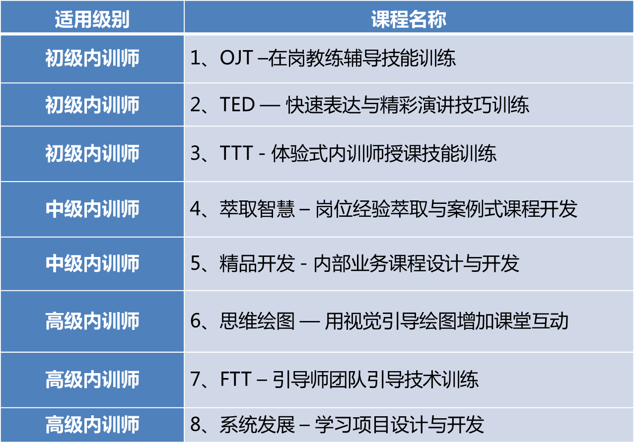 基于百年基業(yè)的基礎性研究,我們后續(xù)還能為您提供覆蓋初、中、高階內訓師及培訓經(jīng)理的標準化系列課程服務(課程培訓、課程內化與種子講師培養(yǎng)) ,使您的內訓師培養(yǎng)與管理工作更加系統(tǒng)化、科學化 !