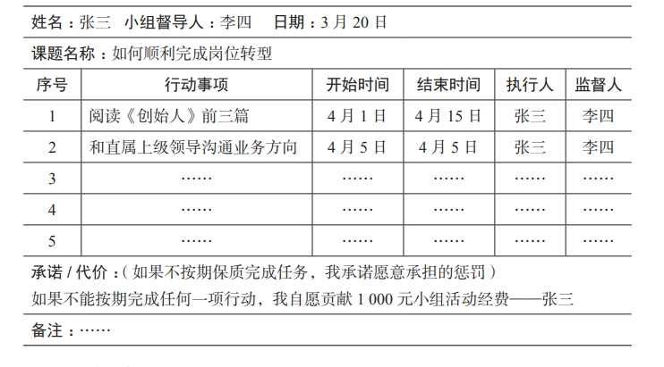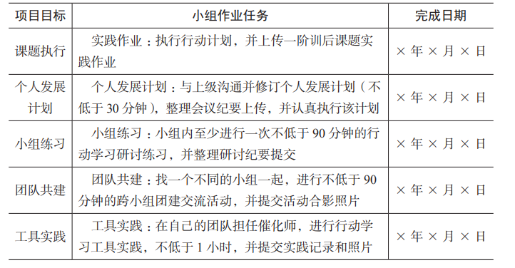 今天開(kāi)始我們將進(jìn)入啟動(dòng)研討階段,主要任務(wù)是開(kāi)好項(xiàng)目啟動(dòng)研討會(huì)。這是整個(gè)項(xiàng)目的第一次集中,標(biāo)志著項(xiàng)目正式開(kāi)啟。 啟動(dòng)研討會(huì)一般需要 2~3 天,主要完成以下幾個(gè)任務(wù)。 S3-1 實(shí)施準(zhǔn)備 :在啟動(dòng)研討會(huì)開(kāi)始前,熟悉學(xué)員和課題,做好場(chǎng)地和物料等準(zhǔn)備。 S3-2 開(kāi)場(chǎng)啟動(dòng) :開(kāi)啟整個(gè)項(xiàng)目,說(shuō)明項(xiàng)目目的,介紹角色、學(xué)習(xí)規(guī)則和項(xiàng)目流程。 S3-3 課題研討 :輸入行動(dòng)學(xué)習(xí)概念和研討技巧,完成課題的第一輪研討。 S3-4 行動(dòng)承諾 :幫助每位學(xué)員制訂精準(zhǔn)的課題行動(dòng)計(jì)劃,在實(shí)踐期執(zhí)行。 今天為大家介紹啟動(dòng)研討階段的第四個(gè)步驟:行動(dòng)承諾。 S3-4 行動(dòng)承諾 啟動(dòng)研討會(huì)結(jié)束之后,學(xué)員迎來(lái)第 1 個(gè)實(shí)踐期。所以在研討會(huì)現(xiàn)場(chǎng),必須推動(dòng)學(xué)員制訂行動(dòng)計(jì)劃,明確實(shí)踐期要采取哪些具體行動(dòng)。這個(gè)行動(dòng)計(jì)劃包括個(gè)人和小組兩方面。 1 個(gè)人行動(dòng)計(jì)劃 首先,每位學(xué)員要有個(gè)人行動(dòng)計(jì)劃,以指導(dǎo)實(shí)踐期的課題執(zhí)行。 通過(guò)行動(dòng)學(xué)習(xí)畫(huà)布研討,每位學(xué)員會(huì)制定若干條解決難題的“行動(dòng)策略”。研討會(huì)結(jié)束時(shí),我通常會(huì)留出時(shí)間,讓學(xué)員把行動(dòng)策略細(xì)化,形成清晰而具體的行動(dòng)計(jì)劃(見(jiàn)下表 )。這份行動(dòng)計(jì)劃包含每個(gè)動(dòng)作的起止時(shí)間、執(zhí)行人(有些行動(dòng)可以授權(quán)他人來(lái)做)和監(jiān)督人。而且要制定行動(dòng)承諾,如不完成計(jì)劃就上交 1 000 元小組經(jīng)費(fèi)。 行動(dòng)學(xué)習(xí)個(gè)人課題行動(dòng)計(jì)劃表 2 小組行動(dòng)計(jì)劃 行動(dòng)學(xué)習(xí)作為一種團(tuán)隊(duì)互助學(xué)習(xí)方法,除了要求個(gè)人采取課題實(shí)踐,還要求整個(gè)小組共同協(xié)作,完成規(guī)定行動(dòng)。 因此在制定個(gè)人行動(dòng)計(jì)劃之后,整個(gè)團(tuán)隊(duì)也需要制定小組的行動(dòng)計(jì)劃。一是為了在解決難題的過(guò)程中提供相互支持,二是為了增強(qiáng)小組的情感連接,提升團(tuán)隊(duì)動(dòng)能。 在設(shè)定小組行動(dòng)計(jì)劃時(shí),應(yīng)該參考項(xiàng)目目標(biāo)。下表就是一個(gè)很好的小組實(shí)踐計(jì)劃樣例,對(duì)應(yīng)五大項(xiàng)目目標(biāo),分別設(shè)置了個(gè)人或小組任務(wù)。這些任務(wù)的完成情況,將影響個(gè)人和小組的積分。 行動(dòng)學(xué)習(xí)小組實(shí)踐計(jì)劃樣例 通過(guò)上表,可以看到一些常見(jiàn)的小組行動(dòng)任務(wù)。 小組自組織研討:小組成員輪流擔(dān)任催化師,在實(shí)踐期進(jìn)行課題跟進(jìn)研討。目的是推動(dòng)課題執(zhí)行,加強(qiáng)組內(nèi)連接,并把行動(dòng)學(xué)習(xí)變成組織文化的一部分。 行動(dòng)學(xué)習(xí)工具實(shí)踐 :小組成員把行動(dòng)學(xué)習(xí)工具帶到自己的業(yè)務(wù)團(tuán)隊(duì),用行動(dòng)學(xué)習(xí)的方式,輔導(dǎo)下屬解決業(yè)務(wù)難題。這可以幫助學(xué)員成為支持型領(lǐng)導(dǎo)者。 跨組團(tuán)隊(duì)共建 :小組之間進(jìn)行團(tuán)隊(duì)共建活動(dòng),目的是在更大范圍內(nèi)加強(qiáng)學(xué)員的相互連接,打破部門(mén)壁壘。 跨界學(xué)習(xí)活動(dòng) :更適合不在同一城市辦公的小組,小組成員可以約定互相拜訪,彼此跨界學(xué)習(xí)。 個(gè)人發(fā)展計(jì)劃溝通 :如果項(xiàng)目包含 360 度領(lǐng)導(dǎo)力測(cè)評(píng)和個(gè)人發(fā)展計(jì)劃,那么可以要求小組成員定期和上級(jí)溝通,跟進(jìn)個(gè)人發(fā)展計(jì)劃的執(zhí)行情況。 以上就是項(xiàng)目啟動(dòng)研討階段的常見(jiàn)任務(wù)。除此之外,你還可以根據(jù)實(shí)際的項(xiàng)目需求,個(gè)性化設(shè)計(jì)一些研討 / 教學(xué)環(huán)節(jié),以幫助實(shí)現(xiàn)項(xiàng)目目標(biāo)。 本文引自《行動(dòng)學(xué)習(xí)畫(huà)布》一書(shū) 下一期思享薈將為大家介紹ADAPT 行動(dòng)學(xué)習(xí)項(xiàng)目設(shè)計(jì)實(shí)施模型圖的第四步-實(shí)踐輔導(dǎo),敬請(qǐng)期待!