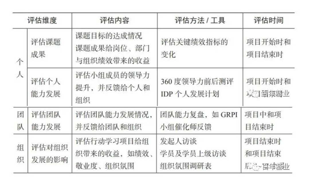 最終,我們將進人 ADAPT 模型的最后一個步驟一一驗收復(fù)盤。這個步驟圍繞課題匯報驗收環(huán)節(jié)展開,并延續(xù)至項目結(jié)束后的評估和持續(xù)深化。 驗收復(fù)盤階段包含以下 4 項關(guān)鍵任務(wù): S5-1 課題復(fù)盤 :幫助小組成員復(fù)盤課題成果,為課題匯報做好梳理,同時對個人和團隊的能力發(fā)展情況進行復(fù)盤。 S5-2 驗收匯報 :組織優(yōu)秀學(xué)員匯報課題成果,評選出優(yōu)秀學(xué)員和優(yōu)秀小組。 S5-3 項目評估 :從個人、團隊、組織 3 個維度,評估行動學(xué)習(xí)項目的價值。 S5-4 持續(xù)深化 :在組織中持續(xù)推廣行動學(xué)習(xí)課題成果,深化行動學(xué)習(xí)在組織中的應(yīng)用,讓項目成果在組織中持續(xù)落地,發(fā)揮作用。 今天為大家介紹S5-3——項目評估。 S5-3 驗收匯報 不僅要評價學(xué)員和小組的課題成果,還要對項目整體的效果進行評估。以從個人、團隊、組織這 3 個維度來評價行動學(xué)習(xí)項目的影響,見下圖。 01 評估課題成果 對于行動學(xué)習(xí)圓桌會項目,課題成果的評估相對較為直觀。 通常來說,每位學(xué)員的課題都設(shè)定了具體可衡量的目標(biāo),并且有明確的行動方案。項目結(jié)束時,通過考察每個課題目標(biāo)達成率,以及行動方案的執(zhí)行情況,就可以對課題成果有一個相對量化的評估對比。 02 評估個人能力發(fā)展 對于個人能力發(fā)展情況,可以使用一些能力量化指標(biāo)進行評估。 例如,通過 360 度領(lǐng)導(dǎo)力前后測評結(jié)果的對比,分析學(xué)員領(lǐng)導(dǎo)力各個維度的提升情況,就可以對學(xué)員的能力成長有一定的了解。此外,也可以看學(xué)員個人發(fā)展計劃的執(zhí)行情況,這能幫評估學(xué)員在幾個定向發(fā)展的能力維度上的進步情況。 03 評估團隊能力發(fā)展 對于團隊能力發(fā)展的評估也十分有意義。因為學(xué)員在行動學(xué)習(xí)小組中獲得的團隊能力,在他回到真實工作團隊中也是可以用到的。 對團隊能力的評估從項目中期就已經(jīng)開始了,前文提到的 GRPI 測評模型,以及配套的 GRPI 團隊能力復(fù)盤工具,就是一套很好的團隊能力評估和發(fā)展工具。另外,在項目結(jié)束之后,小組催化師也可以根據(jù)自己的觀察,對小組團隊能力的成長給出自己的專業(yè)反饋和評價。 04 評估對組織發(fā)展的影響 在組織層面,可以根據(jù)項目目的,選取相關(guān)維度進行評估。 如果行動學(xué)習(xí)項目是績效導(dǎo)向的,那么可以通過關(guān)鍵績效指標(biāo)的提升,來評估項目對組織發(fā)展的影響。例如,某食品集團的項目目的是推進渠道下沉,那么就可以通過新增渠道的數(shù)量,來評估項目的績效成果。如果項目更偏領(lǐng)導(dǎo)力發(fā)展,或者戰(zhàn)略轉(zhuǎn)型,那么更多要靠訪談和調(diào)研的手段,來評估項目成果。 調(diào)研問卷 你可以采用發(fā)放調(diào)研問卷的方式,對行動學(xué)習(xí)項目的組織收益進行評估。 例如,可以通過發(fā)放問卷,來調(diào)研組織氛圍和員工敬業(yè)度方面的改變?;蛘吣阋部梢越Y(jié)合項目目的,專門設(shè)計一份調(diào)研問卷,在組織范圍內(nèi)收集數(shù)據(jù),以幫助評估組織收益。 利益相關(guān)者訪談 項目介紹之后,你還可以跟利益相關(guān)人發(fā)起再次發(fā)起訪談,如項目發(fā)起人、學(xué)員上級、人力資源專業(yè)人士等。通過訪談,可以了解項目在組織層面的影響。 下面是一份利益相關(guān)者訪談提綱,供你參考 : 項目成果匯報給你留下了怎樣的印象? 學(xué)員課題執(zhí)行之后,給組織帶來了哪些影響? 你預(yù)估動學(xué)習(xí)項目的還會帶來哪些持續(xù)收益(績效、團隊建設(shè)、組織氛圍等)? 這些收益對你有什么價值?對組織有什么價值? 你還有其他的評價或建議嗎? 你還愿意再次發(fā)起其他的行動學(xué)習(xí)項目嗎?為什么? 本文引自《行動學(xué)習(xí)畫布》一書 下一期思享薈將為大家介紹ADAPT 行動學(xué)習(xí)項目設(shè)計實施模型圖驗收復(fù)盤之S5-4 持續(xù)深化,敬請期待!