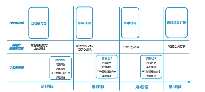 項目原本以行動學(xué)習(xí)和領(lǐng)導(dǎo)力課程輸入為兩條主線,但考慮到學(xué)員三個月才集中培訓(xùn)一次,間隔時間過長,不利于行動學(xué)習(xí)的課題督導(dǎo)和實踐轉(zhuǎn)化,所以我們設(shè)計了第三條線——小組跨界線。