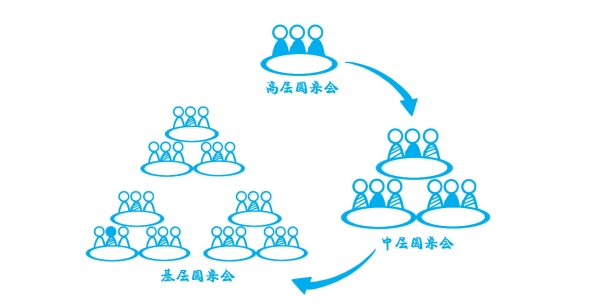 培養(yǎng)內(nèi)部催化師,接力式催化 要想真正推進(jìn)戰(zhàn)略落地,一次性的行動(dòng)學(xué)習(xí)只能算一個(gè)良好的開端,肯定不能一勞永逸。為此,和客戶共同設(shè)計(jì)了后續(xù)的一系列行動(dòng)學(xué)習(xí)工作坊。集團(tuán)本次召集的是高級別管理者,這些人回到自己的區(qū)域,將繼續(xù)召集本區(qū)域下一級別管理者進(jìn)行類似的研討。 如此多場次的催化,不可能完全借助外部催化師來實(shí)施。為了讓項(xiàng)目順利進(jìn)行,組織了 F 公司的內(nèi)部催化師訓(xùn)練。原則上,基層的研討,由內(nèi)部催化師帶領(lǐng) ;中層的研討,由外部催化師擔(dān)任主顧問,內(nèi)部催化師負(fù)責(zé)每個(gè)小組的具體催化。 這樣多層行動(dòng)學(xué)習(xí)的設(shè)計(jì)(見下圖),一層層不斷納入更多員工,才能真正推進(jìn)變革在組織內(nèi)的真正落實(shí)。 多層行動(dòng)學(xué)習(xí)的設(shè)計(jì)