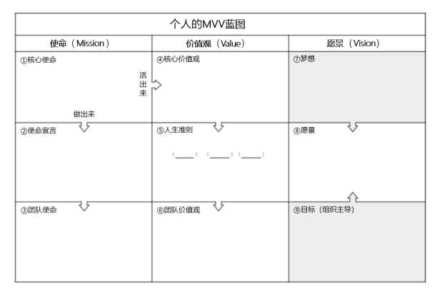真北團(tuán)隊(duì)是基于使命的生命成長(zhǎng)共同體,而我們個(gè)人的真北就是我們的MVV[Mission(使命),Vision(愿景),Value(價(jià)值觀)]。每個(gè)人加入這個(gè)小組之后,必須使用個(gè)人的 MVV 藍(lán)圖(見(jiàn)下圖 )明晰自己的使命、愿景、價(jià)值觀。當(dāng)每位成員都明晰了自己的 MVV 之后,在探討難題、做出重要決策時(shí),就有了堅(jiān)實(shí)的抓手。