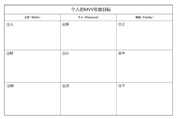 此外,還需要結(jié)合個(gè)人的 MVV,從工作、個(gè)人和家庭 3 個(gè)大維度、9 個(gè)子維度,設(shè)定自己的年度目標(biāo)(見(jiàn)下圖),以指導(dǎo)我們切實(shí)地活出自己的MVV。當(dāng)進(jìn)行每月復(fù)盤(pán)時(shí),也要不斷核對(duì)年度目標(biāo)的達(dá)成情況。