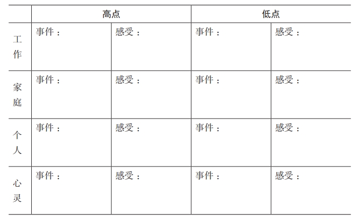 每次活動(dòng)我們都會(huì)使用“高點(diǎn)與低點(diǎn)”工具(見(jiàn)下表),從工作、家庭、個(gè)人、心靈 4 個(gè)維度做復(fù)盤(pán),回顧過(guò)去一個(gè)月發(fā)生的事情。每個(gè)維度都會(huì)分享高點(diǎn)事件和低點(diǎn)事件。分享高點(diǎn)事件時(shí),我們都感覺(jué)到一種勝利的快感 ;分享低點(diǎn)事件時(shí),我們也會(huì)感到彼此有連接,為各自提供支持。這種系統(tǒng)的月度復(fù)盤(pán)對(duì)人的成長(zhǎng)十分有益,如果沒(méi)有創(chuàng)業(yè)家圓桌會(huì),相信很難堅(jiān)持做這樣有價(jià)值的事情。