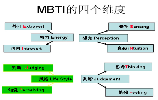 - 解性格傾向的四個(gè)構(gòu)面:怎樣與外界互動(dòng);接受信息的傾向;作決定的方式;怎樣安排自己的時(shí)間和生活。