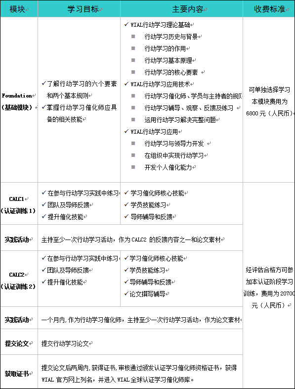 CALC1(認(rèn)證訓(xùn)練1)和CALC2(認(rèn)證訓(xùn)練2):費(fèi)用20700元(含認(rèn)證課程、論文審核,證書頒發(fā)及午餐費(fèi)用等)。基礎(chǔ)模塊學(xué)習(xí)之后,才有資格學(xué)習(xí)本模塊,考核合格者可獲得WIAL的認(rèn)證,本階段每次學(xué)員被認(rèn)證數(shù)量不超過8名,名額以WIAL-Beijing資格審核及課程全款到達(dá)百年基業(yè)指定賬戶的先后順序?yàn)橐罁?jù)。