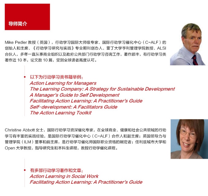 行動(dòng)學(xué)習(xí)在中國(guó)市場(chǎng)的發(fā)展已呈如火如荼態(tài)勢(shì),與此同時(shí)行動(dòng)學(xué)習(xí)資源及產(chǎn)品質(zhì)量良莠不齊,為了能讓中國(guó)企業(yè)接觸和了解到專(zhuān)業(yè)優(yōu)質(zhì)的國(guó)際行動(dòng)學(xué)習(xí)資源,百年基業(yè)邀請(qǐng)兩位行動(dòng)學(xué)習(xí)國(guó)際大師級(jí)專(zhuān)家、國(guó)際行動(dòng)學(xué)習(xí)催化中心(C-ALF)的創(chuàng)始人Mike Pedler先生和Christine Abbott女士來(lái)到中國(guó),舉辦一次權(quán)威專(zhuān)家與企業(yè)高管、HR負(fù)責(zé)人思想碰撞的高端分享會(huì)。令企業(yè)高管、HR負(fù)責(zé)人有機(jī)會(huì)走近大師,聆聽(tīng)經(jīng)典,獲得最為精粹的行動(dòng)學(xué)習(xí)知識(shí)。