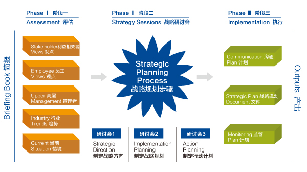 下圖示例了戰(zhàn)略規(guī)劃的三個階段(評估階段,戰(zhàn)略研討會階段,執(zhí)行階段)。通過這三個階段,學(xué)習(xí)在規(guī)劃流程期間和前后應(yīng)該完成的事項(xiàng)